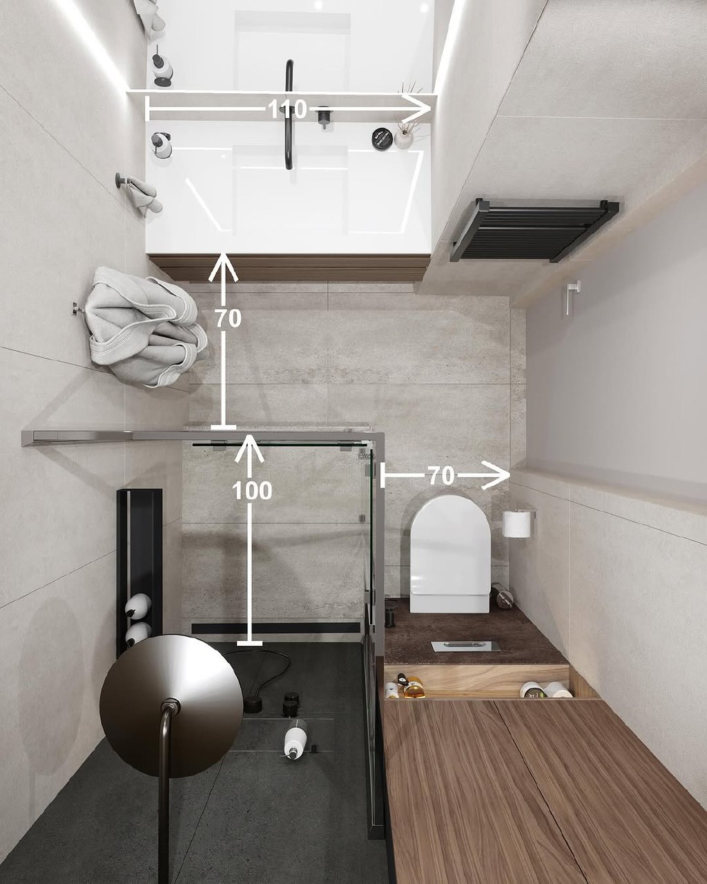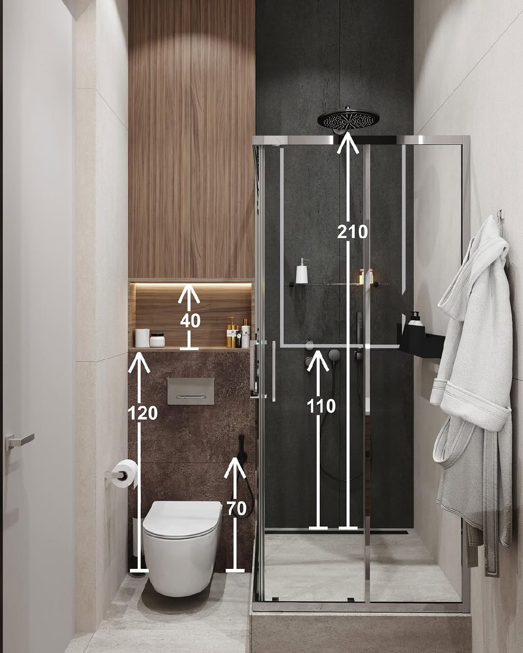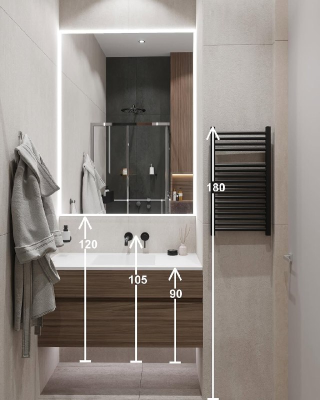 Эргономика — это наука о том, как сделать пространство удобным для человека. В ванной важно обеспечить свободное перемещение и доступ ко всем предметам. Запомните главные цифры:
