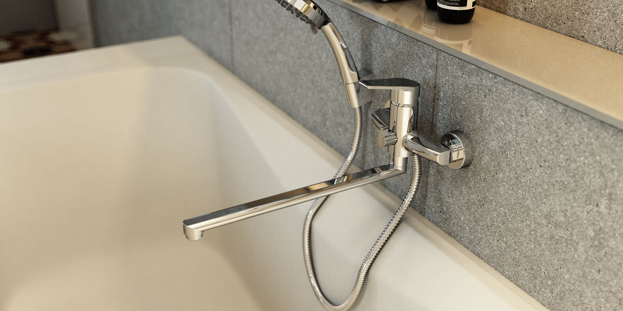 Для ванн с широким бортом или сложной формой ключевое значение имеет монтажное положение смесителя. Если он установлен на борту далеко от центра, длинный излив — необходимость.