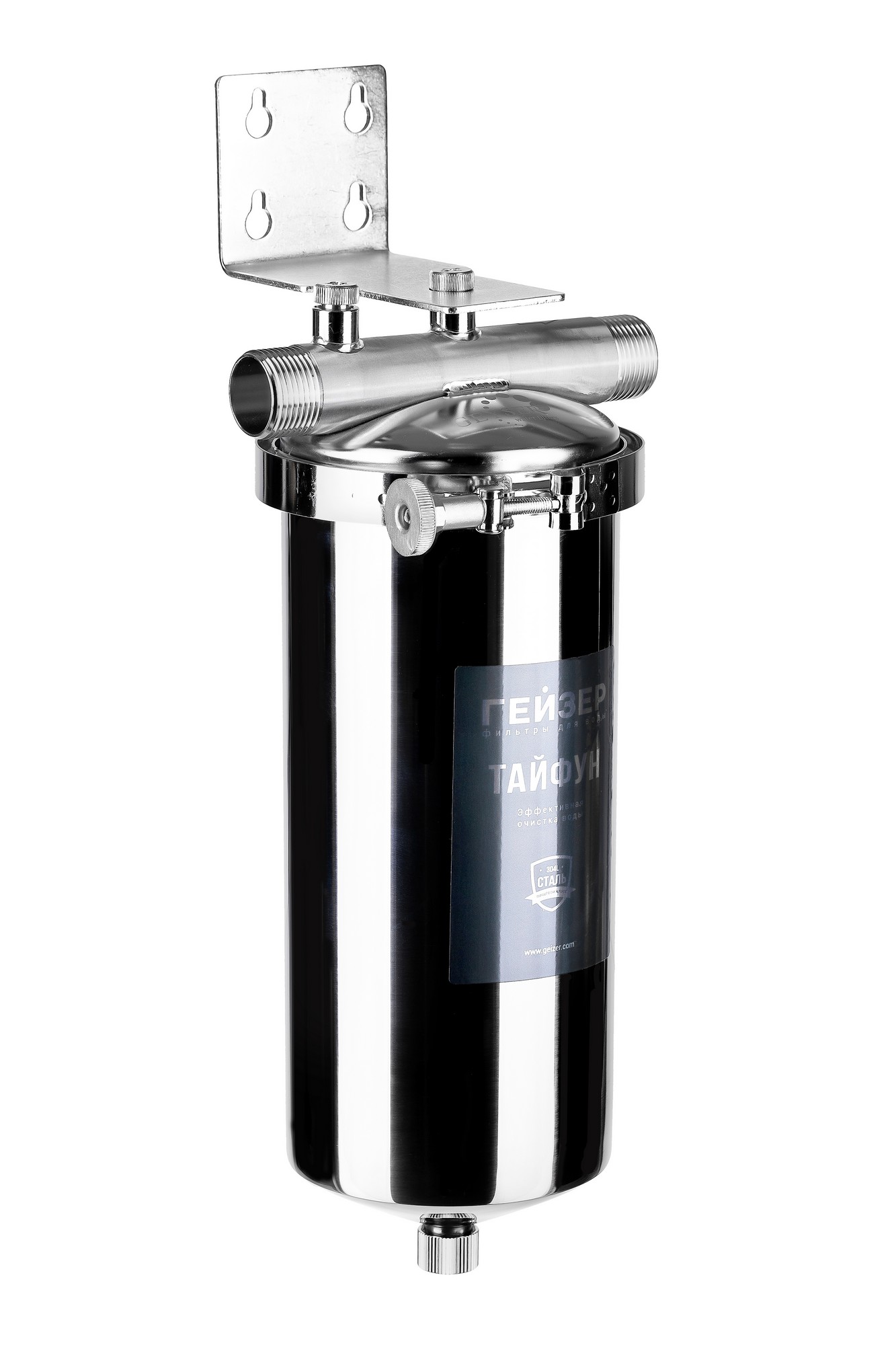 Корпус и крышка фильтра Гейзер Тайфун 10BB изготовлены из высококачественной нержавеющей стали марки 304L с металлической скобой. Корпус рассчитан на работу под давлением и установку на входе в систему горячего или холодного водоснабжения. Внизу корпуса находится клапан слива воды для удобной замены картриджа.