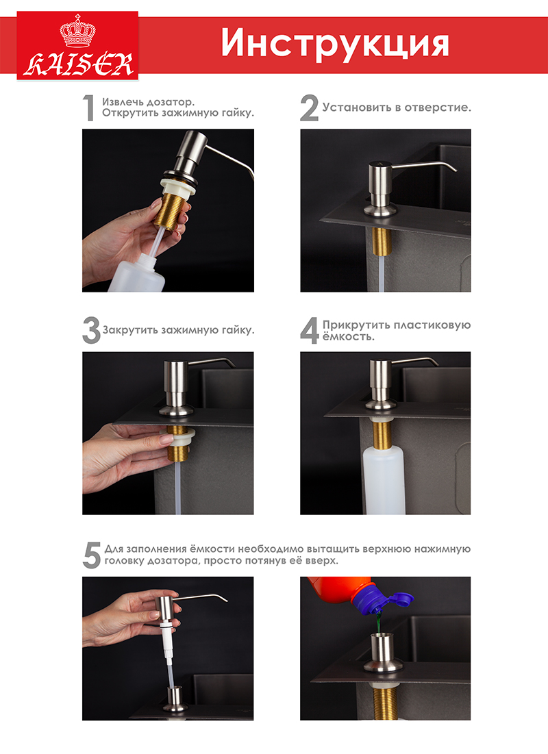 Дозатор KAISER для моющих средств встраиваемый /Латунь,пластик /Чёрный матовый