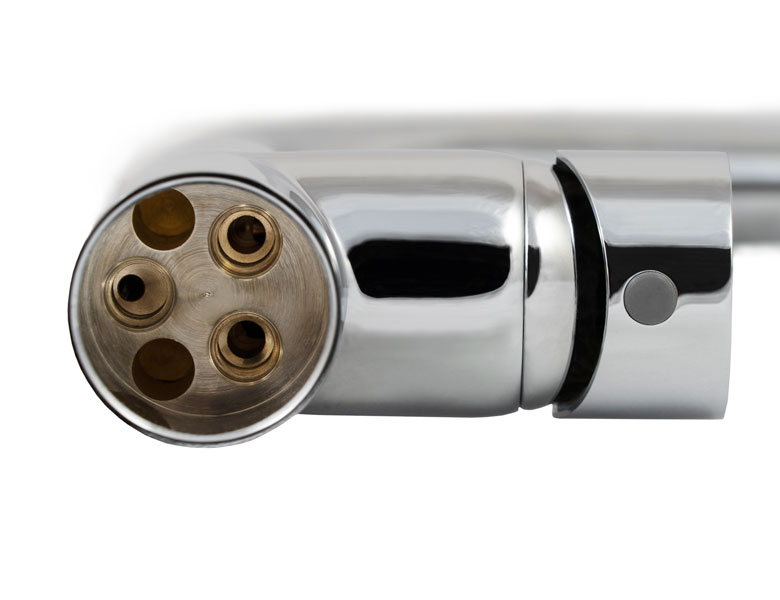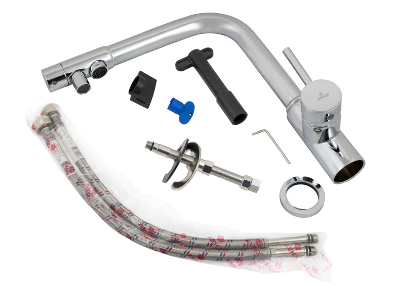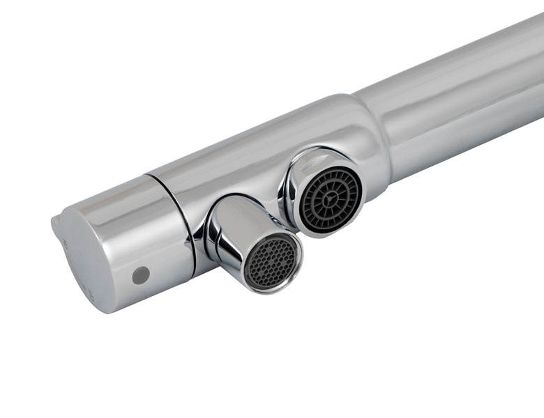 Смеситель Kaiser 13044 из коллекции Teka совмещен с краном для питьевой воды. Особенность модели заключается в сдвоенном изливе, внутри которого проходят две трубки, для питьевой и проточной воды. Два аэратора для раздельного выхода проточной и фильтрованной воды, исключают возможность их смешивания. Подача питьевой воды осуществляется переключателем на конце излива. Преимущество совмещенных смесителей заключается в том, что не нужно делать дополнительных отверстий на мойке и устанавливать отдельный кран для питьевой воды.