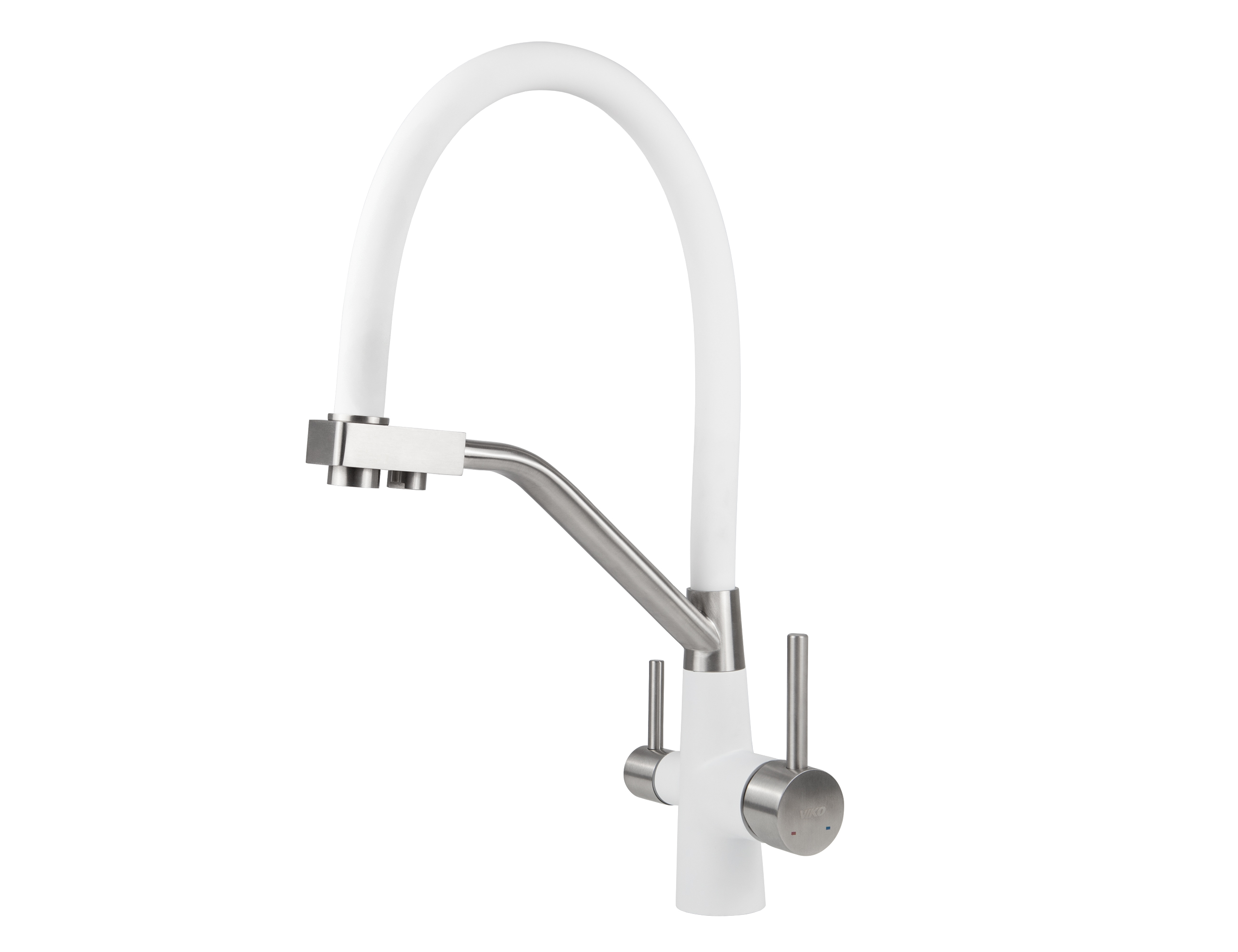 Смеситель VIKO для кухни под фильтр с гибким изливом Ø35, нерж. сталь (корпус/излив: белый, серебро/белый)