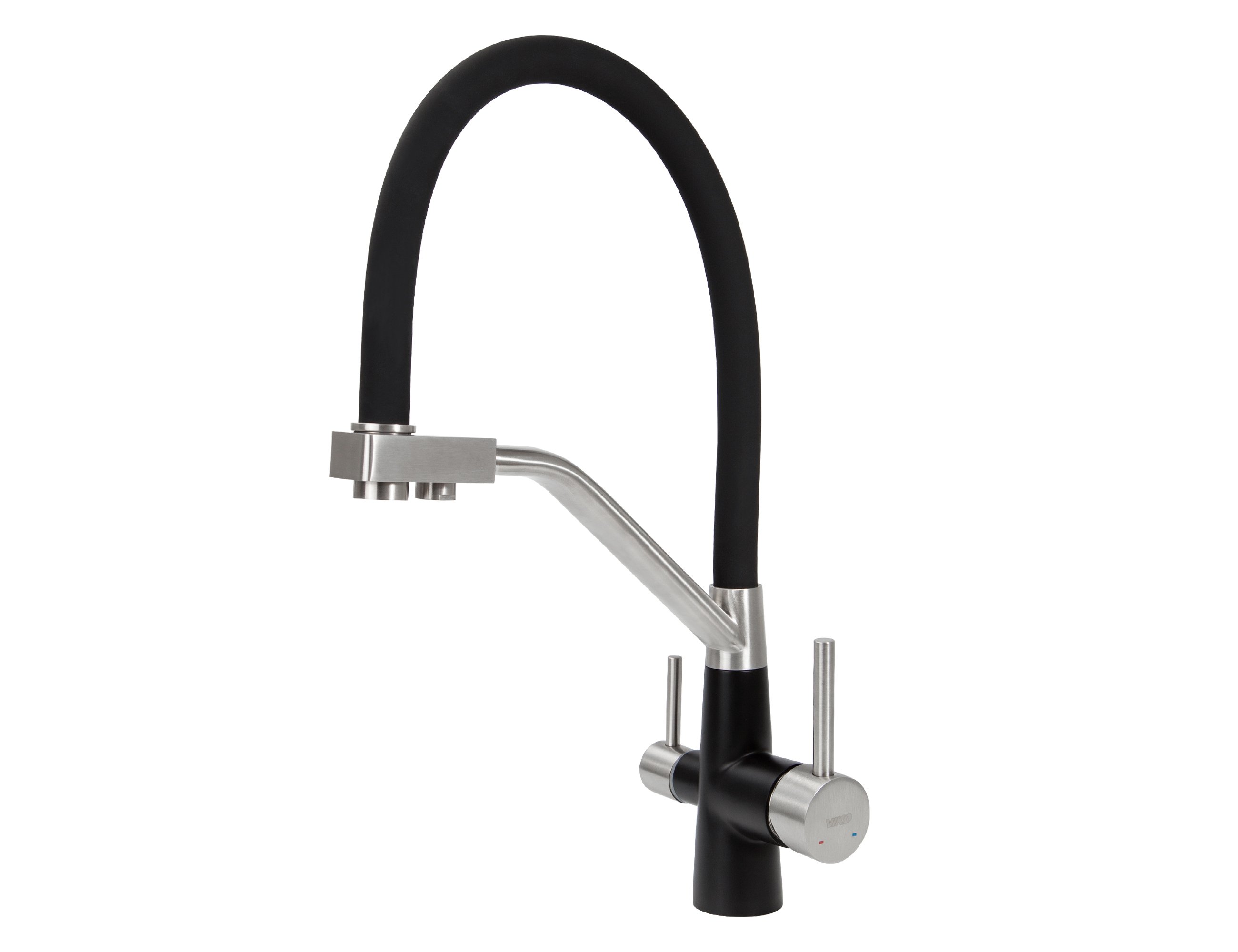 Смеситель VIKO для кухни под фильтр с гибким изливом Ø35, нерж. сталь (корпус/излив: черный матовый, серебро/черный)