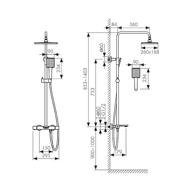 смеситель, релинг, верхний душ, душевая лейка, держатель лейки, шланг, крепления