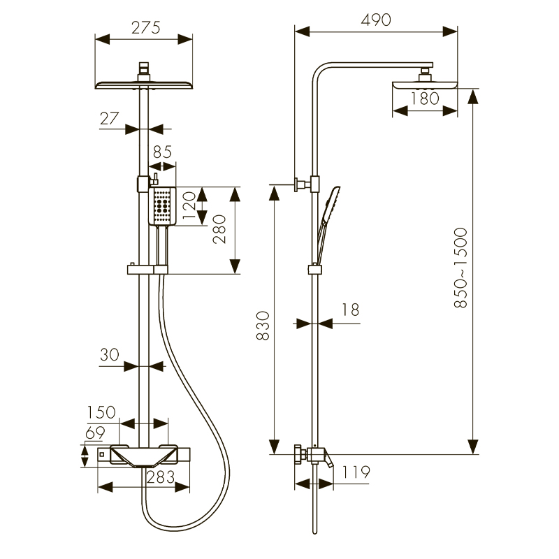 смеситель, релинг, верхний душ, душевая лейка, держатель лейки, шланг, крепления