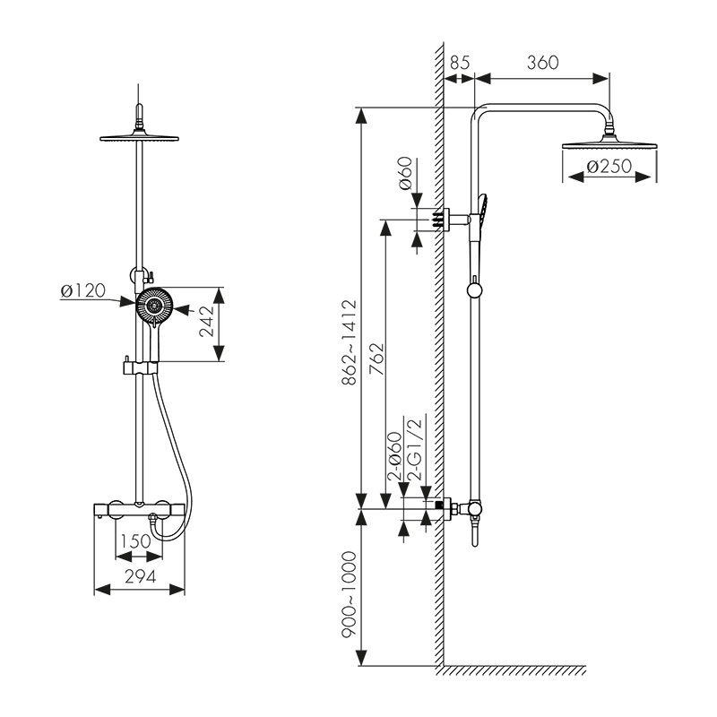 смеситель, релинг, верхний душ, душевая лейка, держатель лейки, шланг, крепления
