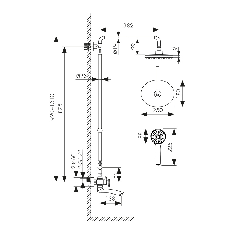 смеситель, релинг, верхний душ, душевая лейка, держатель лейки, шланг, крепления
